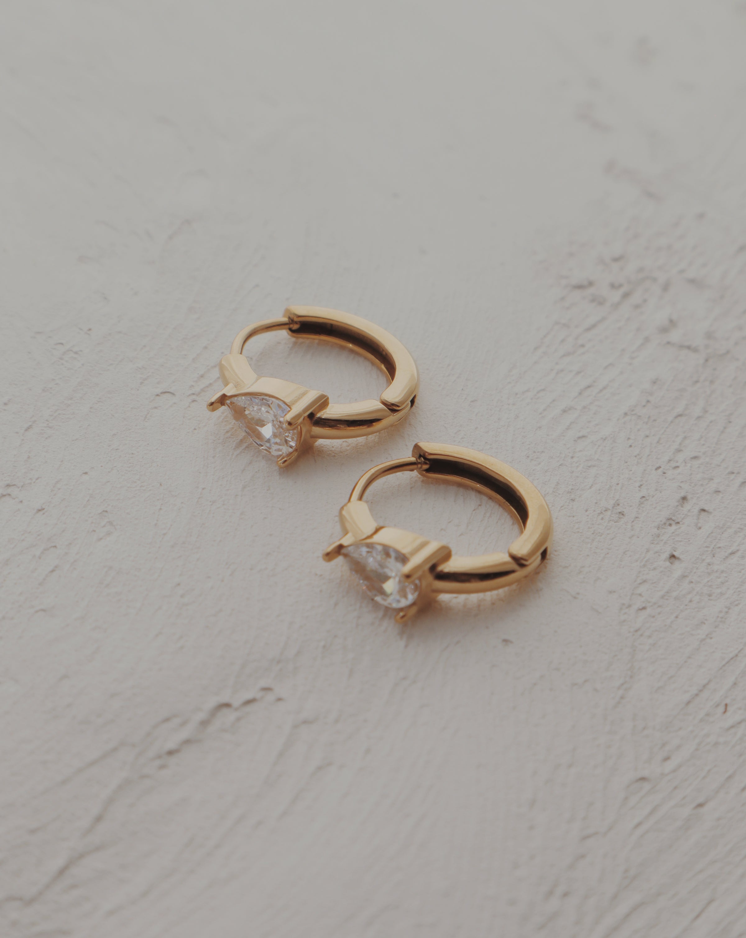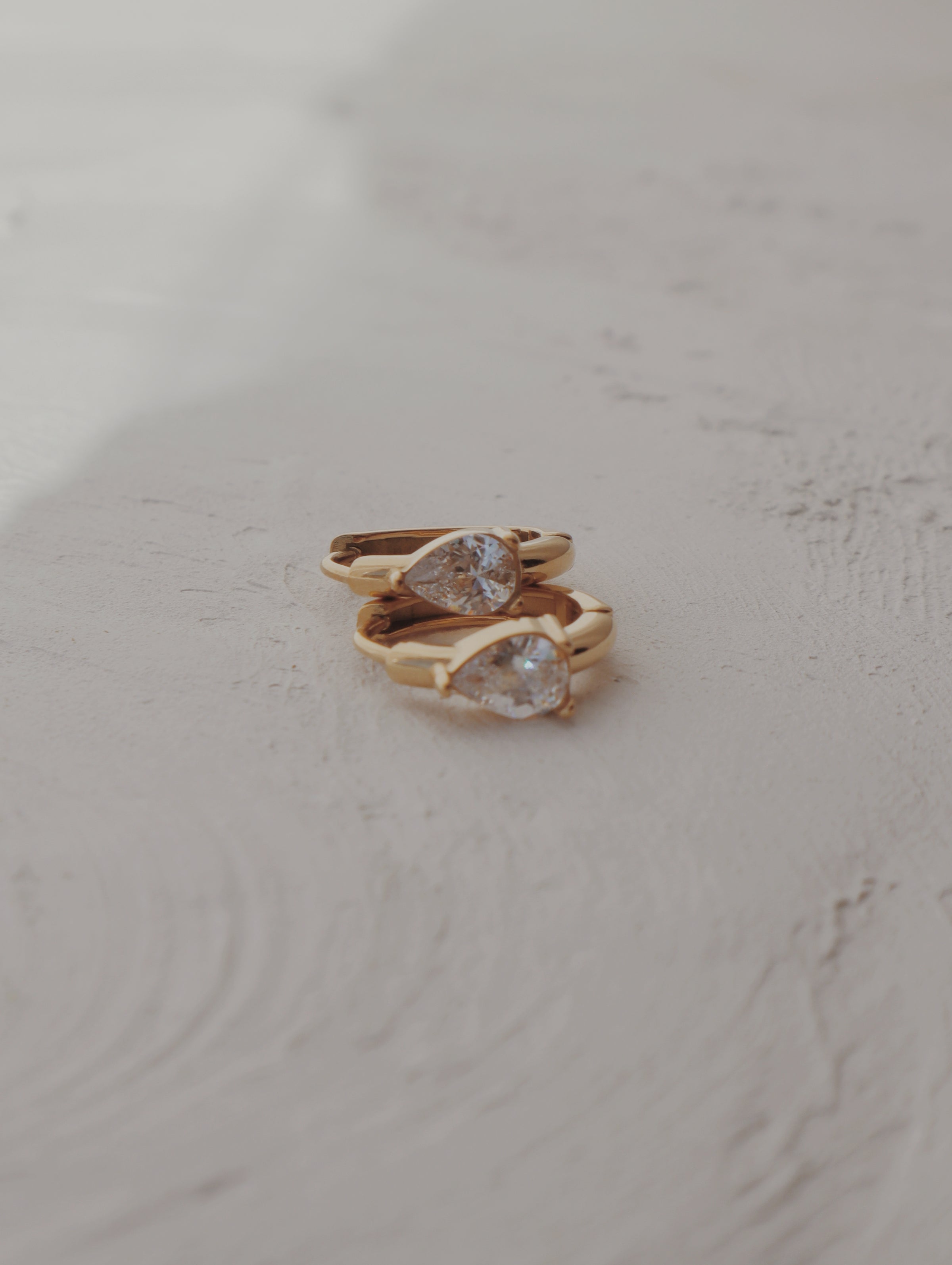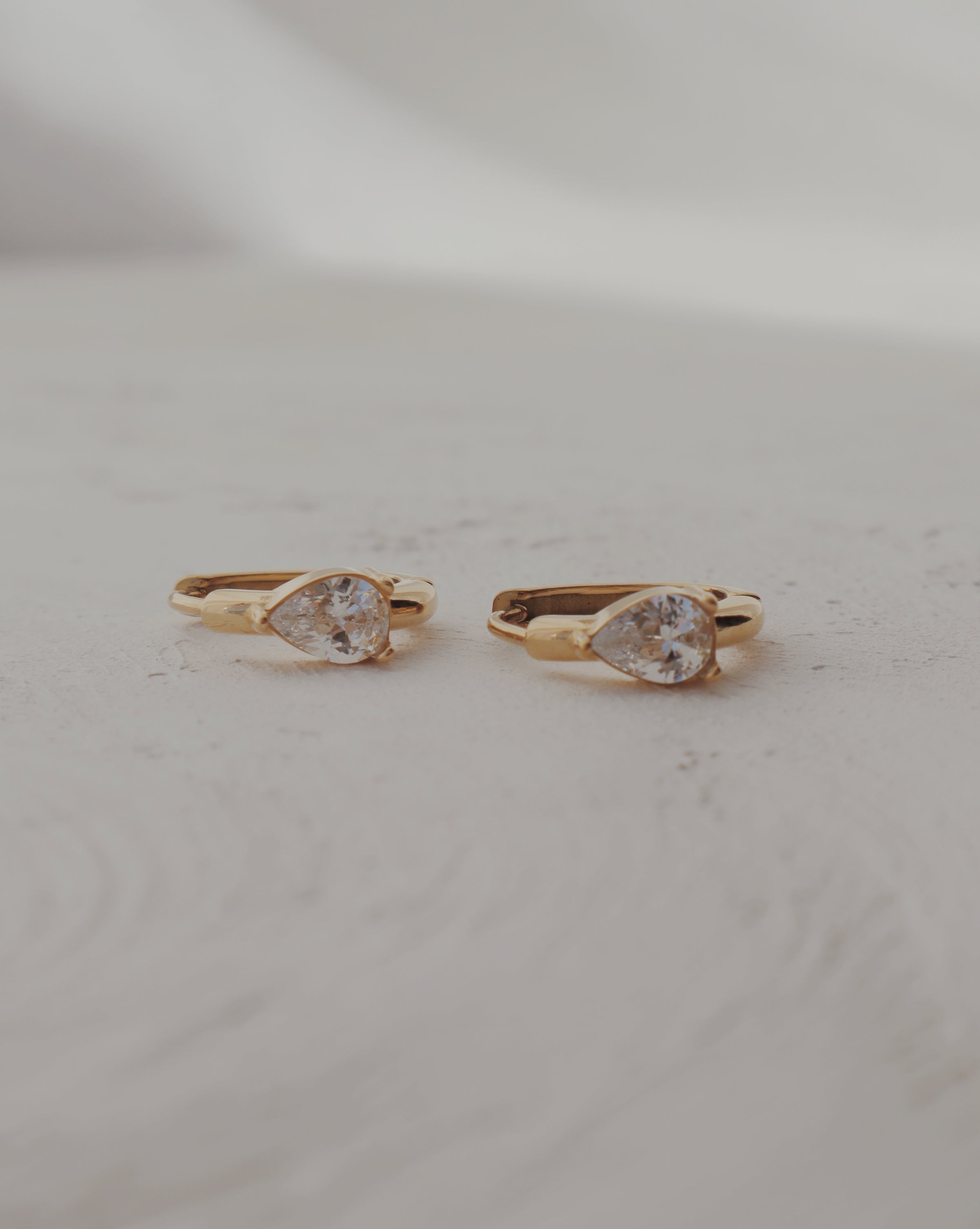 Pear shaped, clear cubic zirconia stone on a slightly tapered huggie hoop.