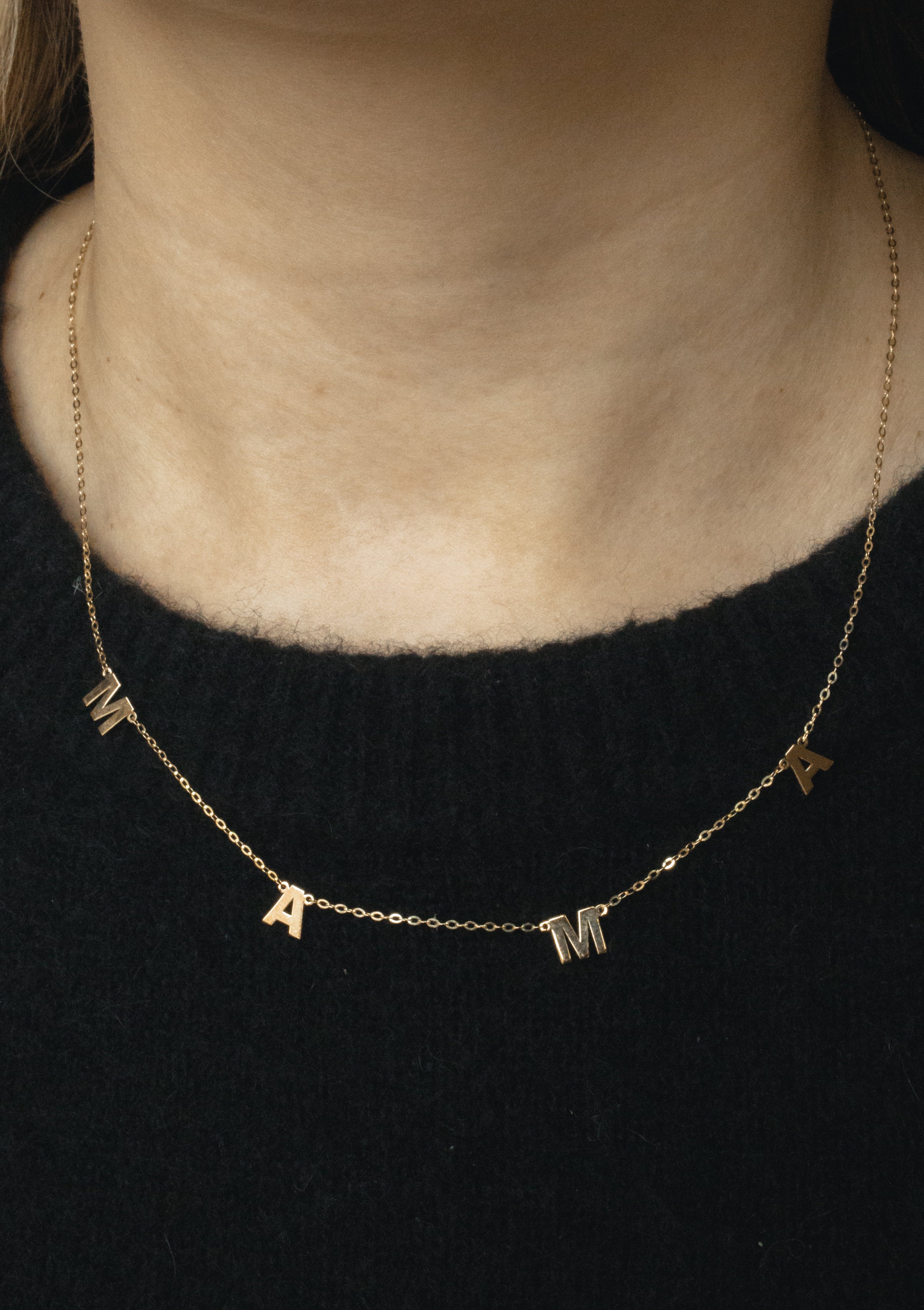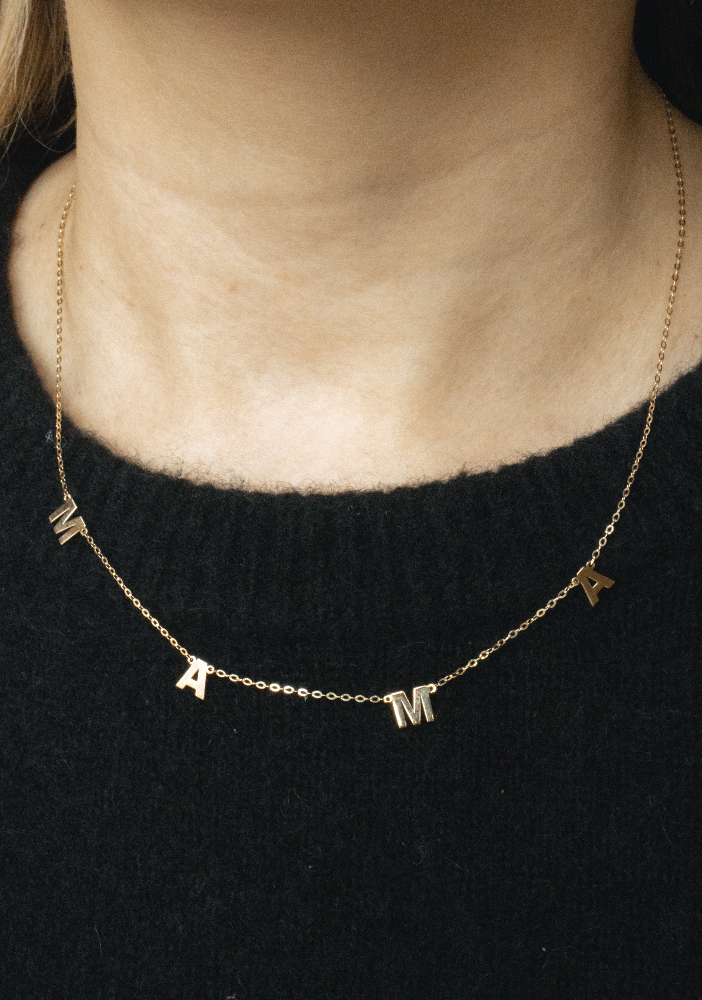 Mama spaced out across a dainty sold gold chain.
