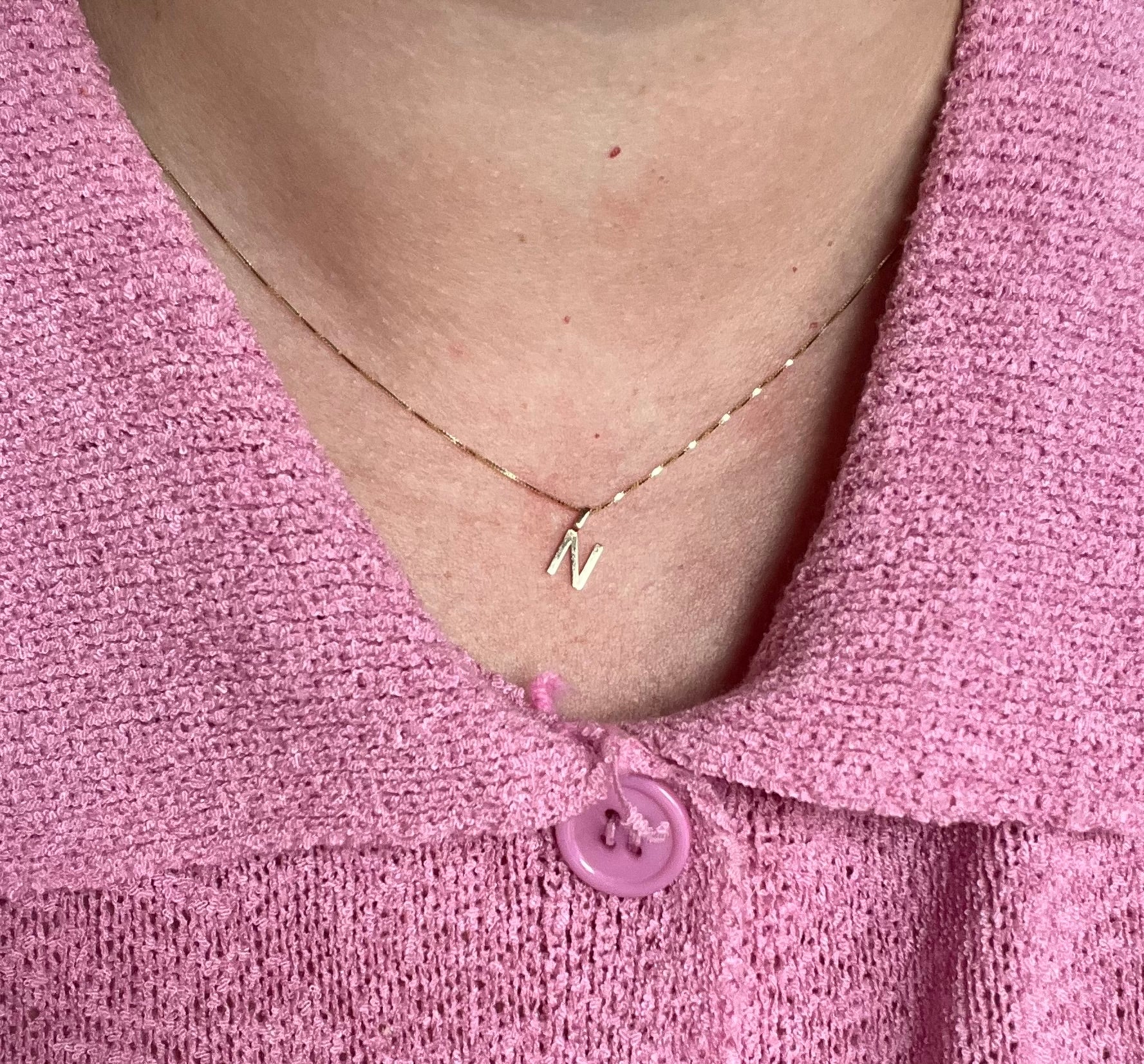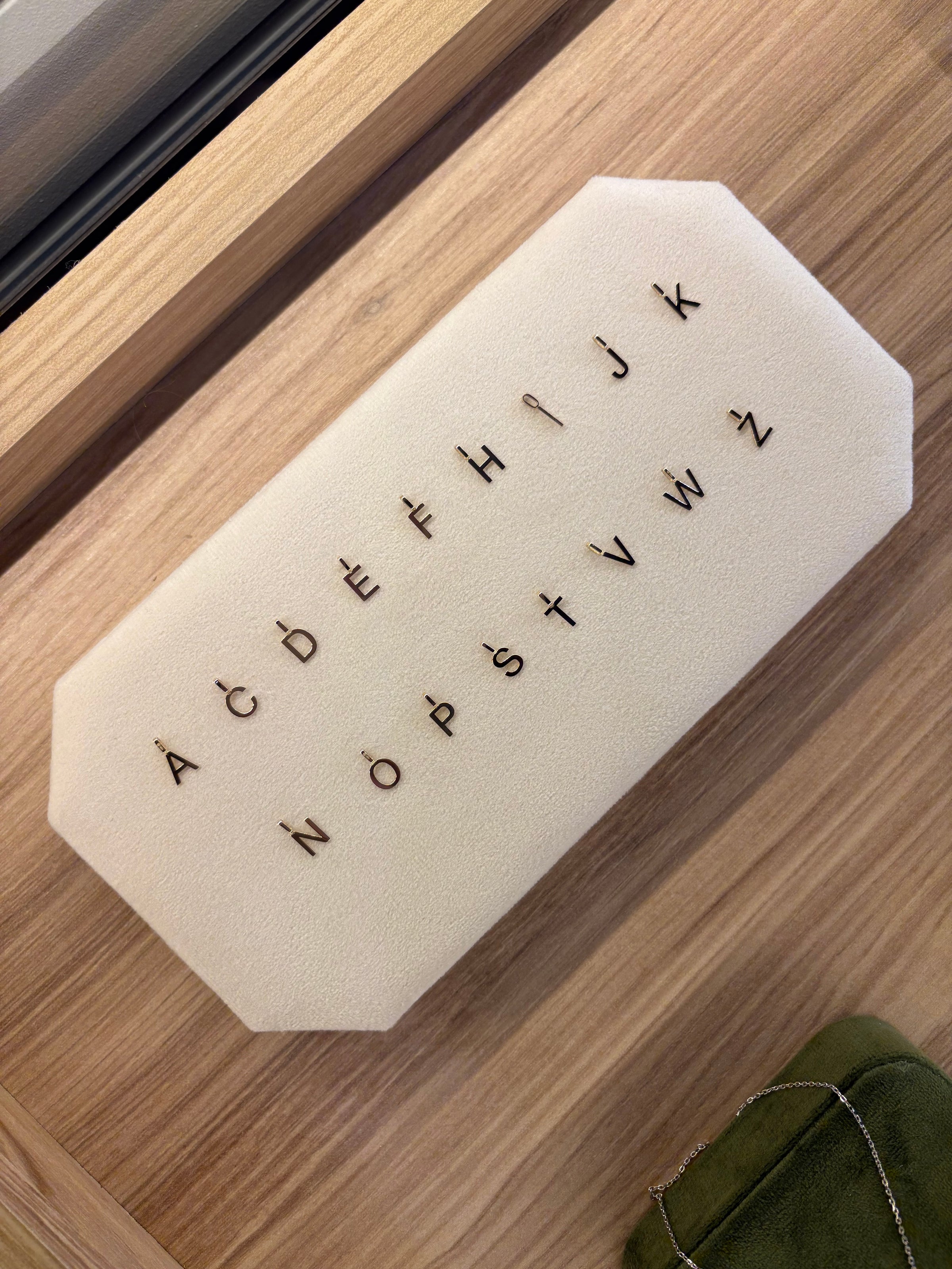 Dangling Letter charms crafted from solid gold.