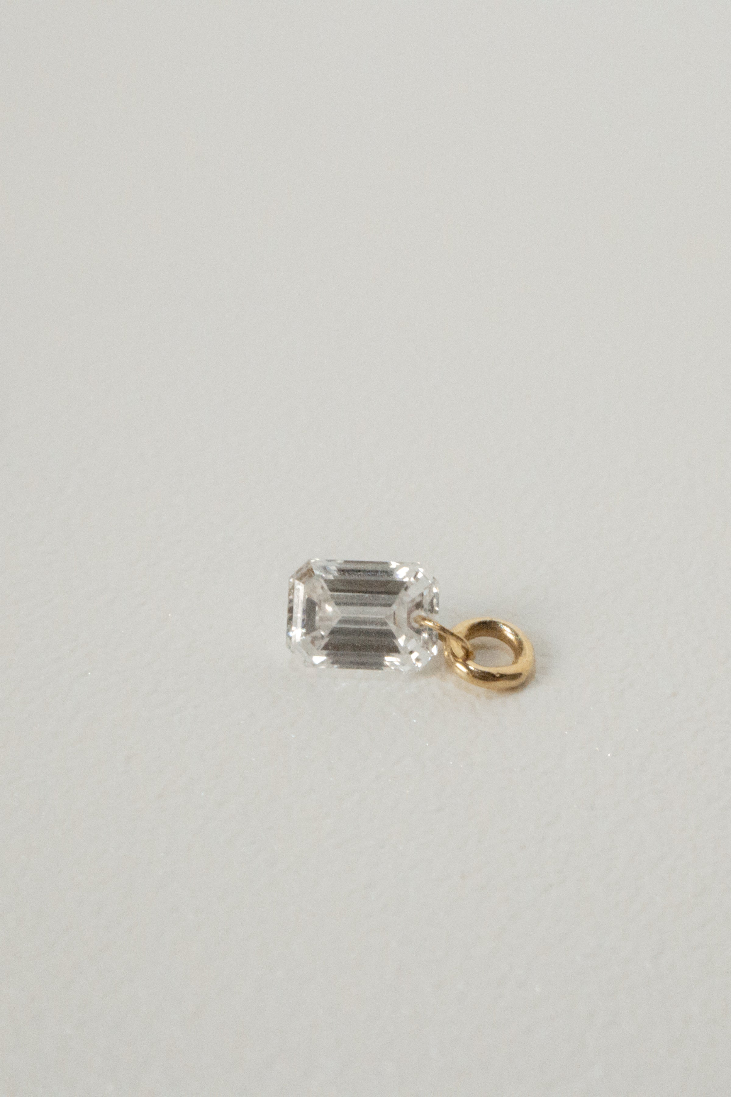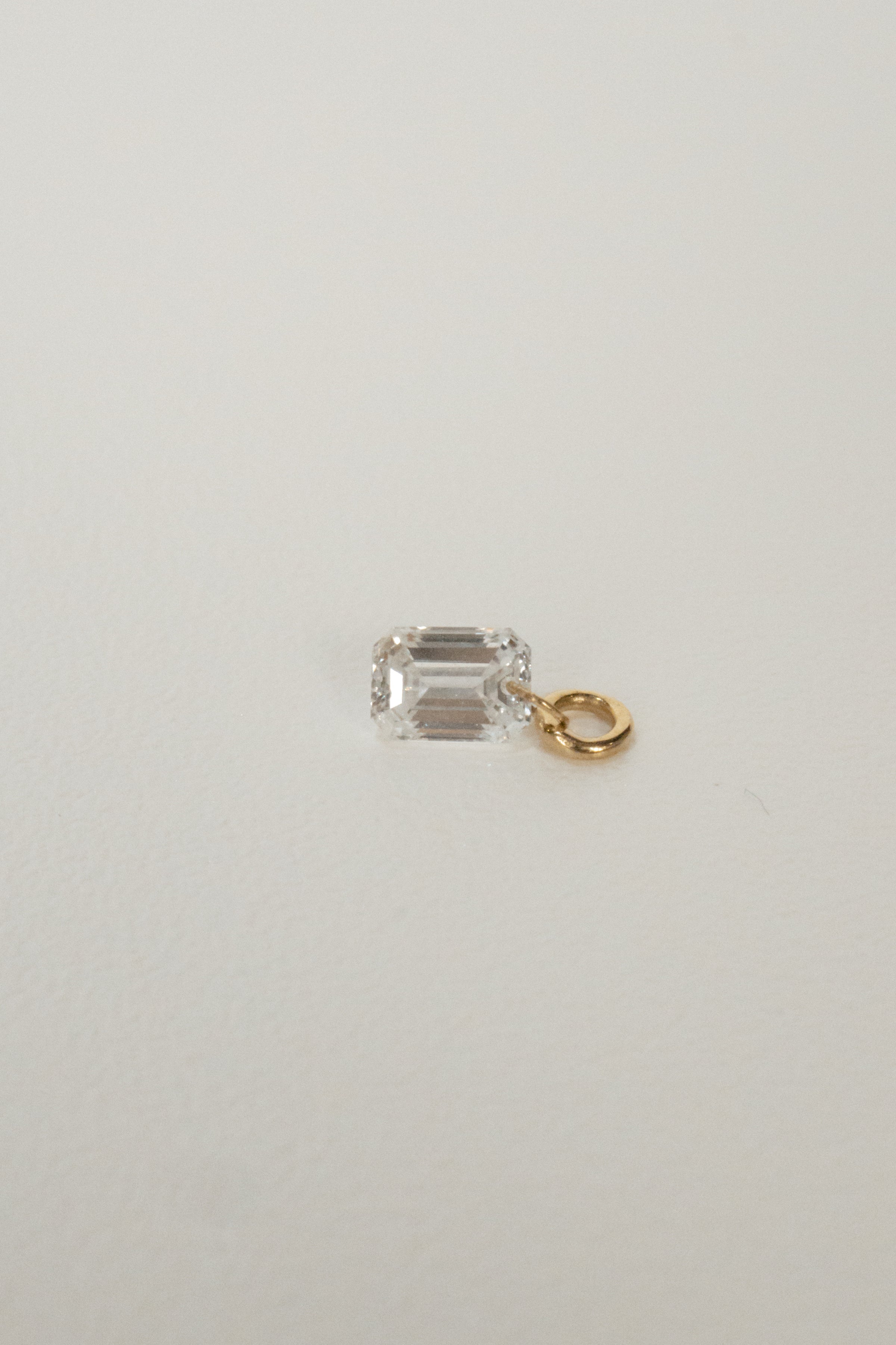 Emerald cut diamond in a setting that gives a floating illusion. This charm can be added to necklace, bracelets, or hoop earrings.