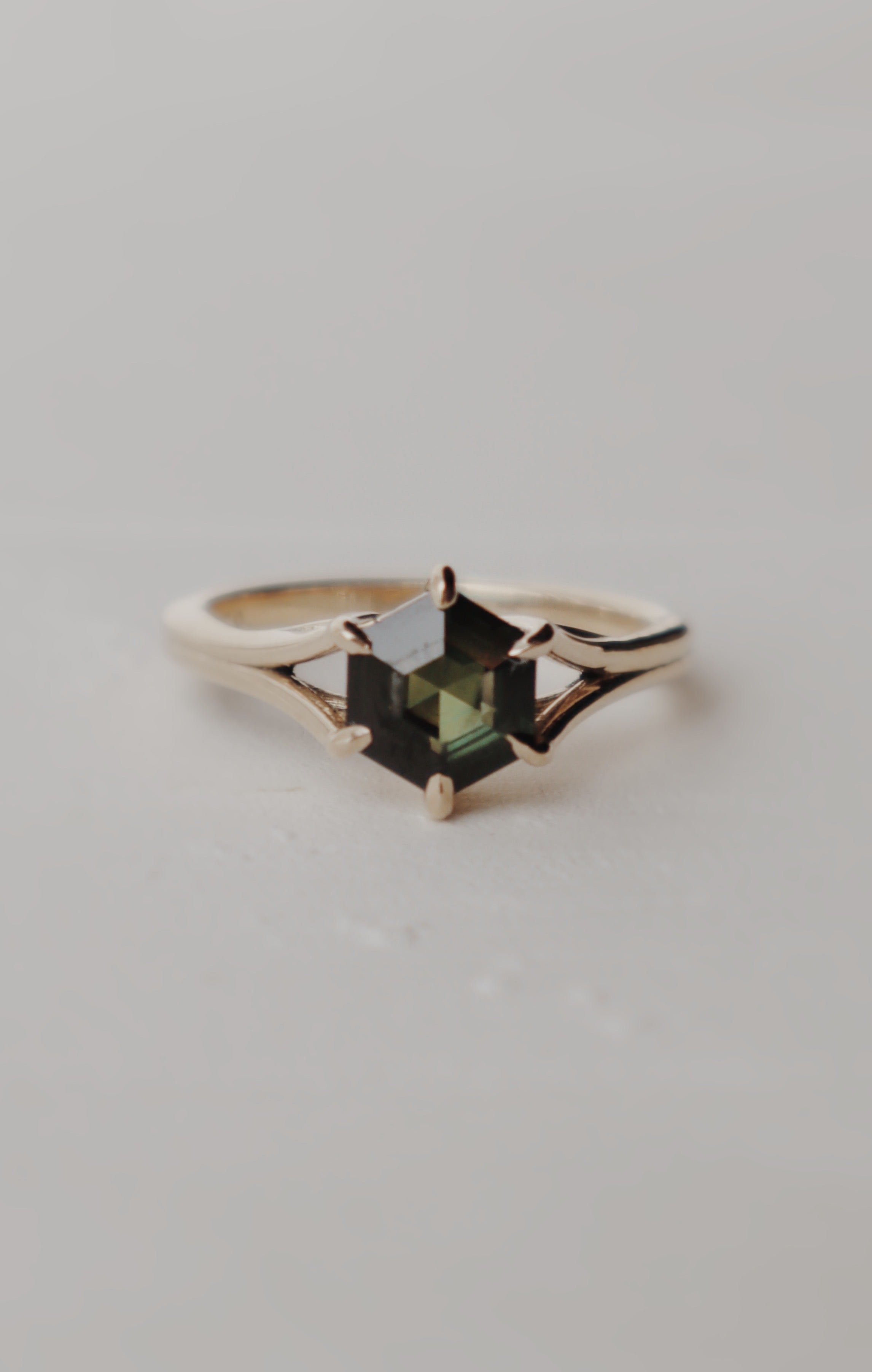 For the bride looking for a unique ring, the Larson Engagement Ring boasts 1.40 CT natural green sapphire with an edgy and modern hexagon shape. This sapphire has a rich colour and will definitely stand out.